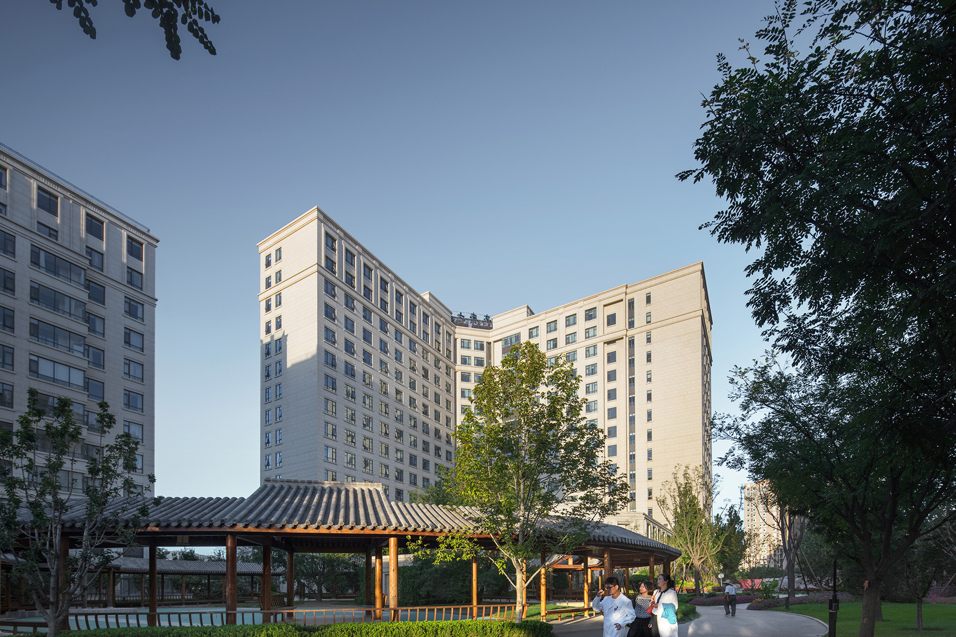 总体规划采用围合式建筑布局与医养结合配套体系相融合的布局方式,根据不同养老模式的需求和特点分区布局,每个区域既可独立运营管理,又能有机融合;分区设置配套设施,通过步行街相连,形成了贯穿整个社区的综合服务体系。突破常规的南北向行列式布局,通过围合与半围合的建筑布局,形成不同尺度的院落空间,为老人营造具有安全感和归属感的邻里交往场所。