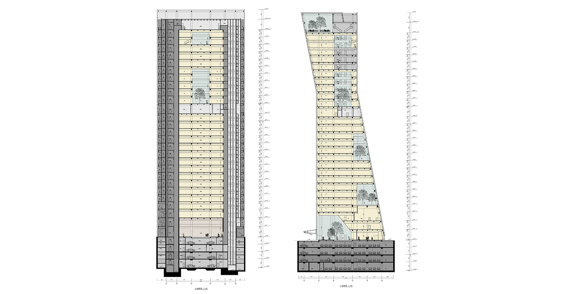 由于本地块的特殊位置,建筑造型需要有足够的标志性和可识别性,同时还应具有一定的城市尺度和现代感,以满足后海中心区的新时代,新中心区的特殊要求。倾斜的建筑造型很好的体现出建筑的时代感与流畅感,建筑物不再是高层塔楼与低层裙房的传统关系,而是将裙房与塔楼结合在一起形成更加整体的体型关系,更好的体现高层建筑的整体感,为后海中心区增加活力。