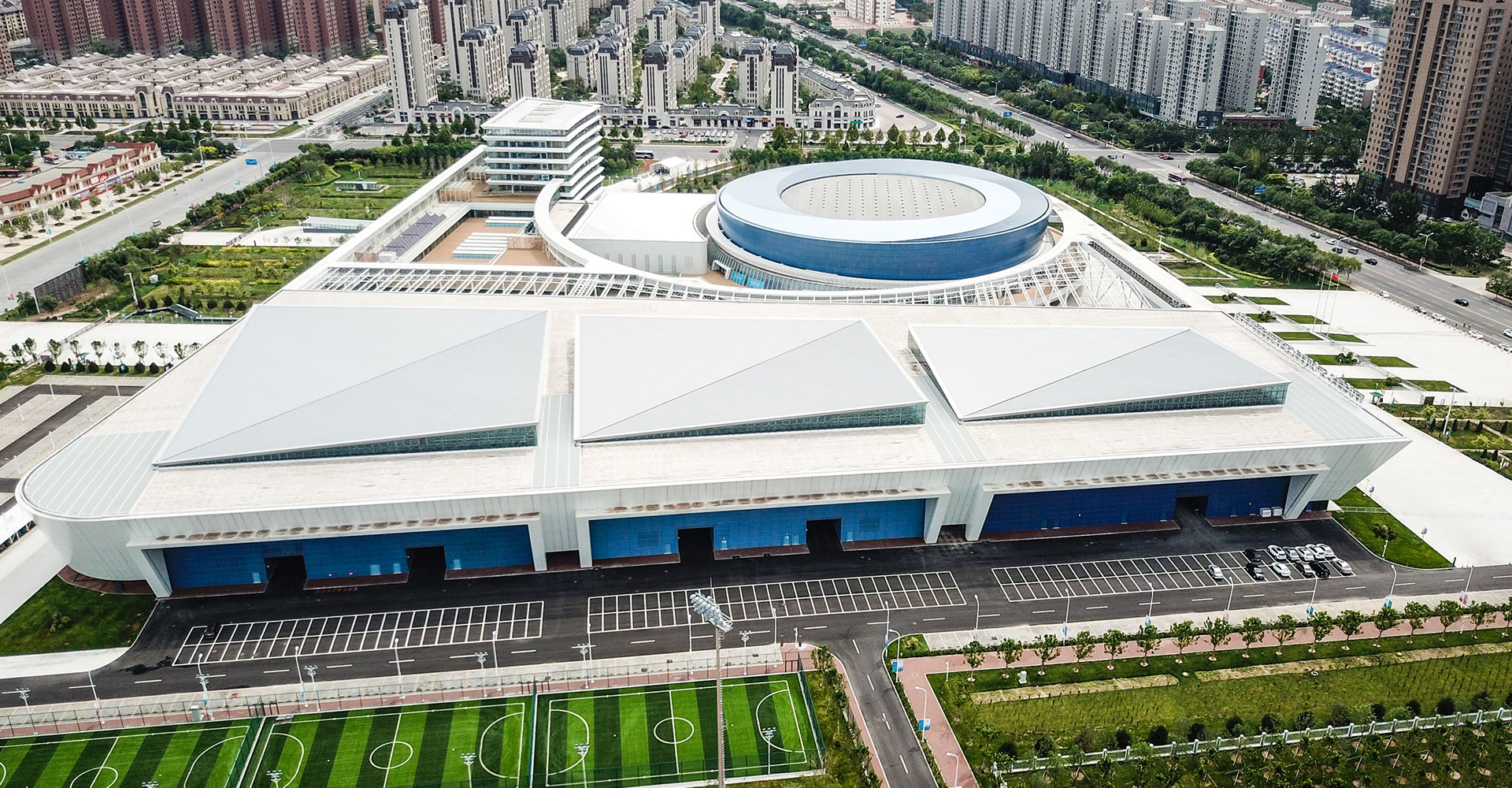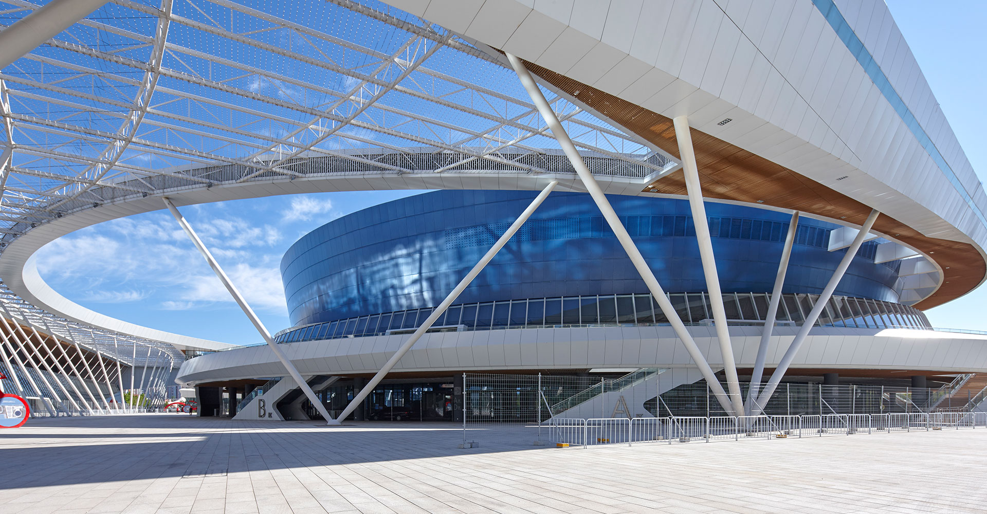 强调多个单体的体育建筑从功能到形式上的整合,同时将场馆间的相对消极的空间通过半室外化的空间营造,尝试变为积极的活动空间,并与城市空间相对接。在后期实际运营期间,功能一体化为使用带来了很大的便利、空间一体化带来了鲜明而有力的建筑形态、建筑虚空成为了提升使用者感受的“亮点空间”。