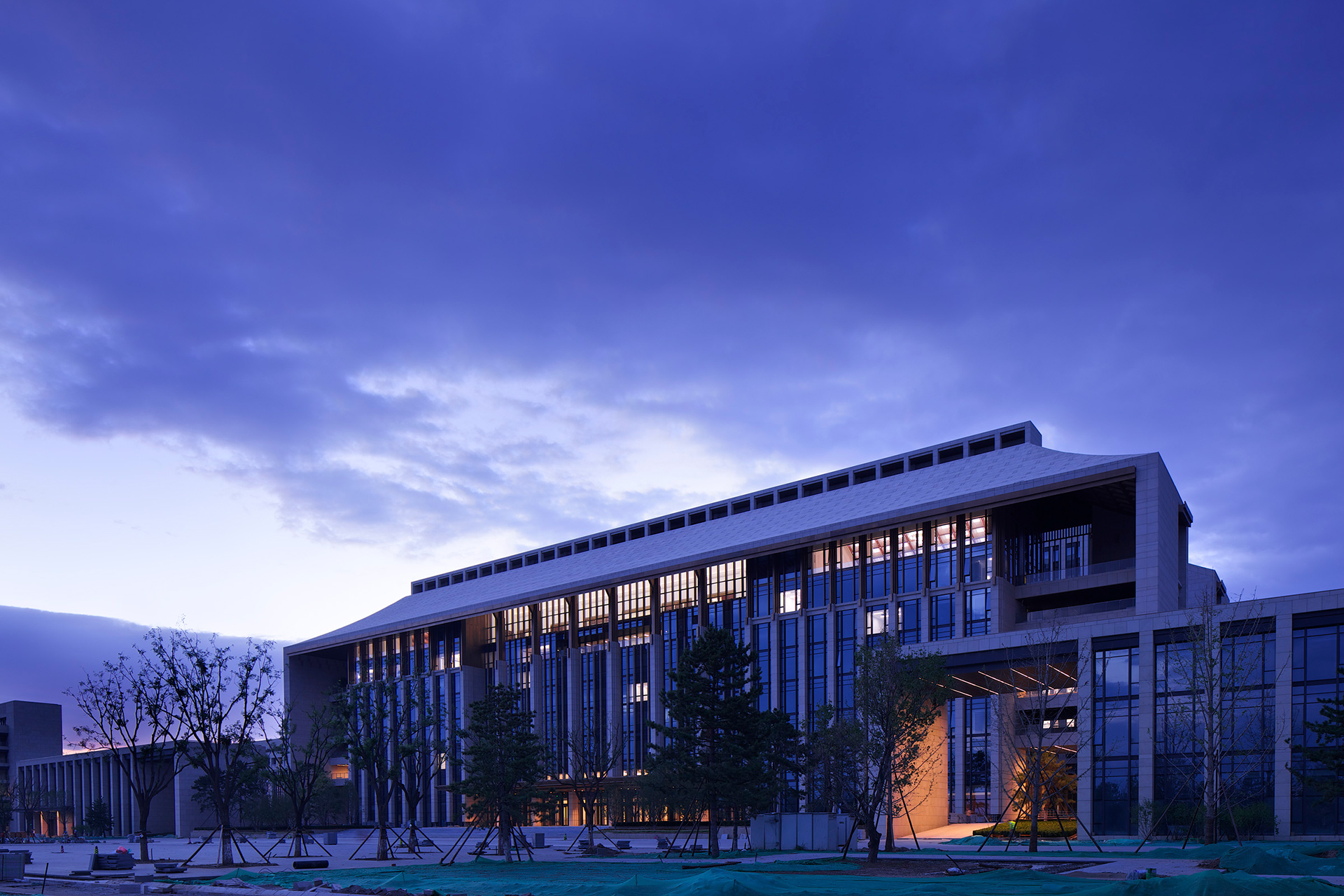 新中式坡屋面与周围自然环境融合,石材幕墙厚重典雅,简朴庄重,檐口下的吊顶部分采用藻井式处理营造出中国传统建筑屋檐处的空间氛围。