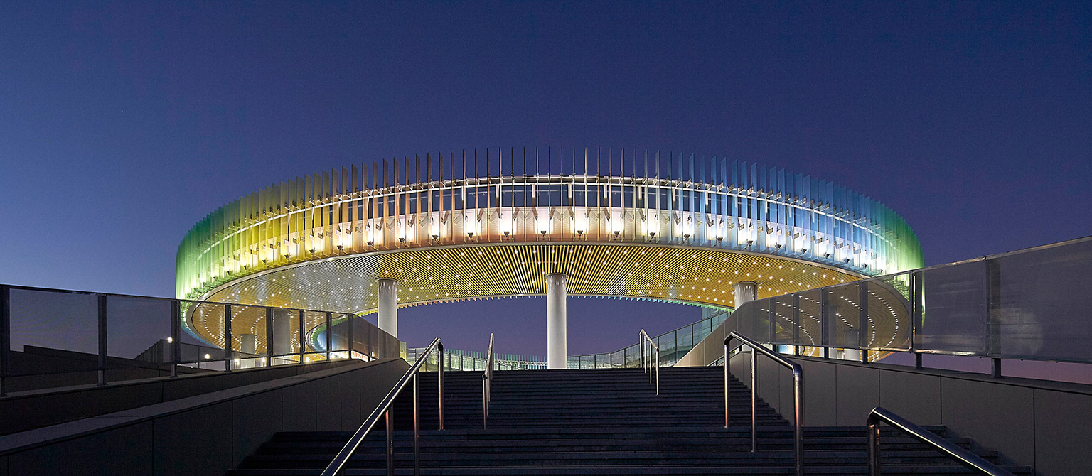二层环廊,建筑造型要求为单排环形框架柱两侧悬挑钢梁,两侧悬挑长度随框架柱位置和板边线的变化而变化,为提高结构抗震性能,二层环廊采用钢管混凝土柱框架结构,并进行中震弹性性能化设计,楼盖采用密肋钢梁+闭口型压型钢板组合楼承板,其中,钢管混凝土柱内浇注C40灌浆料,钢管混凝土柱之间采用箱形钢梁连接,并从钢管混凝土柱和箱形钢梁上悬挑工字形钢梁。