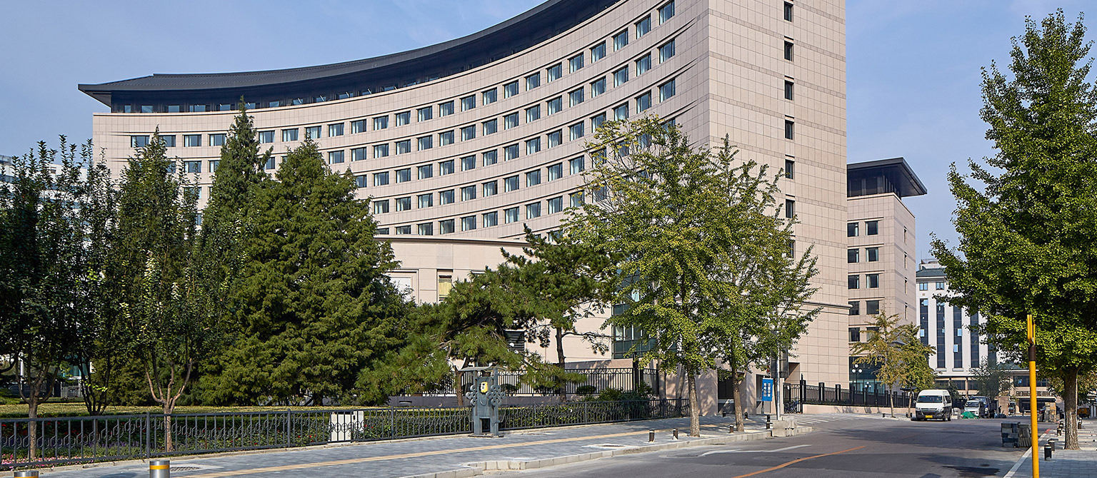 在维持原有建筑形象的同时,进行优化设计,尊重妇联历史和本地段建筑文脉,与周围环境协调,体现沉稳,庄重,包容,不张扬的理念。布局上因地制宜,将原有主体南侧扩建一礼仪大厅,整个建筑群体近似“工”字形,在东侧围合为一个东院,为日常人流车流提供回转空间,南部为礼仪性出入口空间紧邻城市绿化带。