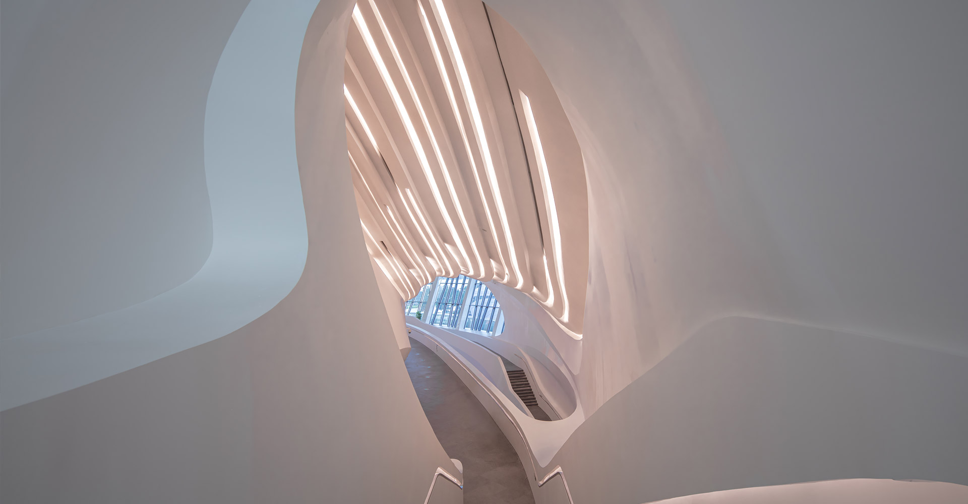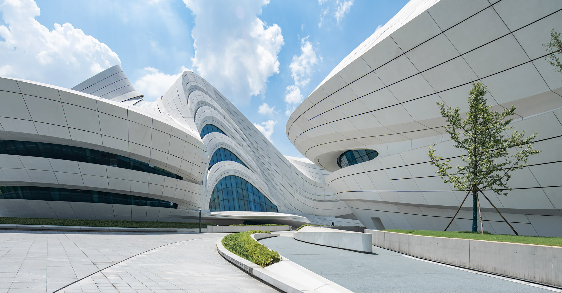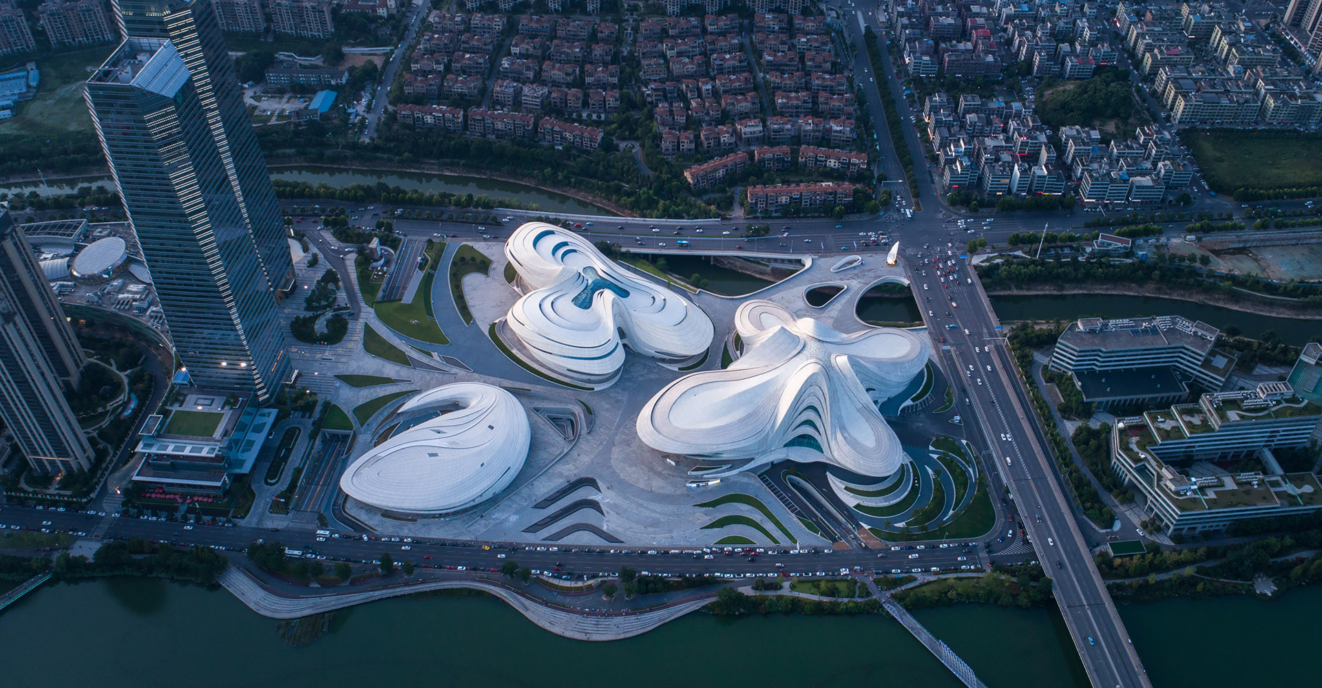 本项目三个建筑造型缘起于“梅花”,每个单体由“梅花”的花瓣衍生而来。大剧场为四片花瓣,艺术馆为三片花瓣,小剧场为一片花瓣,高高低低地散落在梅溪湖畔。三个抽象的造型均为行云流水般的流线型设计,主体均为(钢)框架-钢筋混凝土剪力墙结构体系,屋盖均为单层钢网格结构体系。