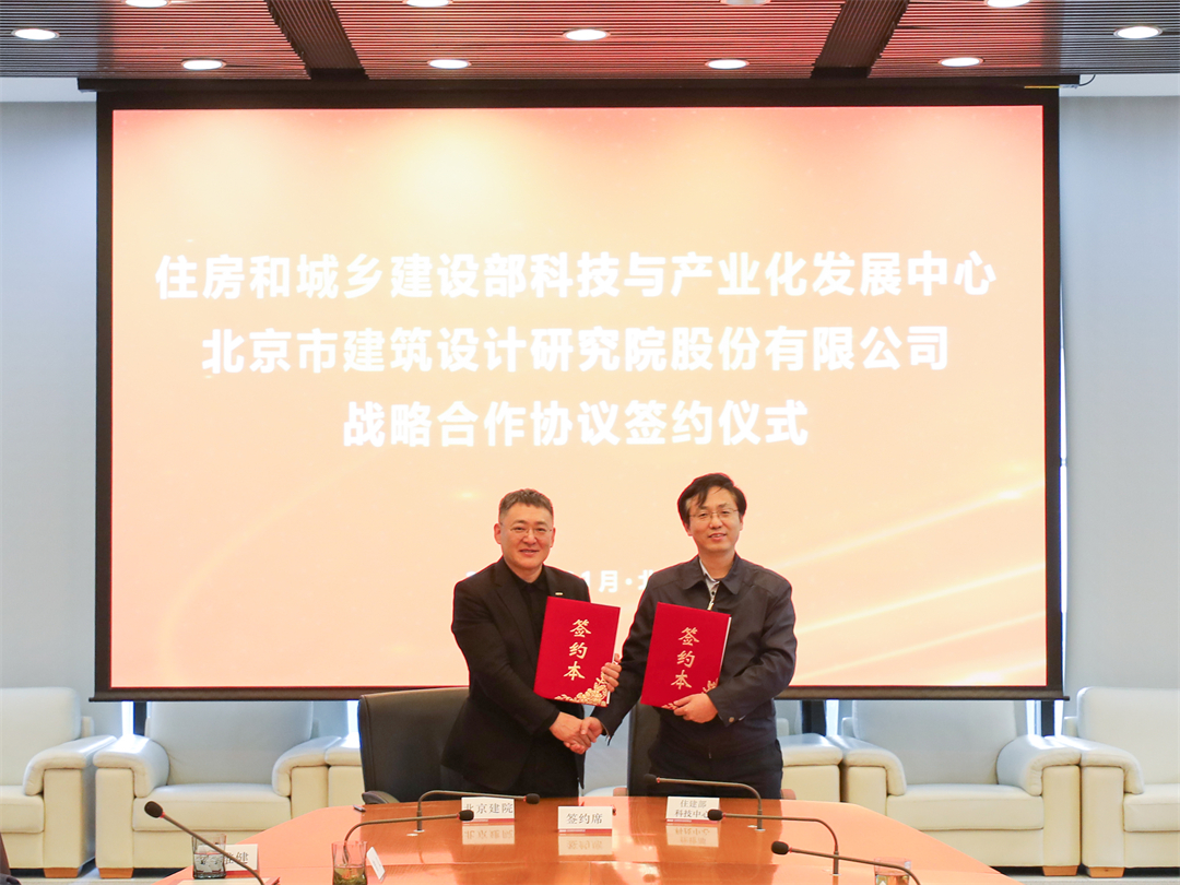 2024年1月18日,北京市建筑设计研究院股份有限公司与住房和城乡建设部科技与产业化发展中心在京签署战略合作协议,北京建院党委书记、董事长徐全胜,住建部科技与产业化发展中心党委书记、主任刘新锋出席签约仪式。住建部科技与产业化发展中心党委委员、副主任黄海群,北京建院副总经理郑琪等出席仪式。