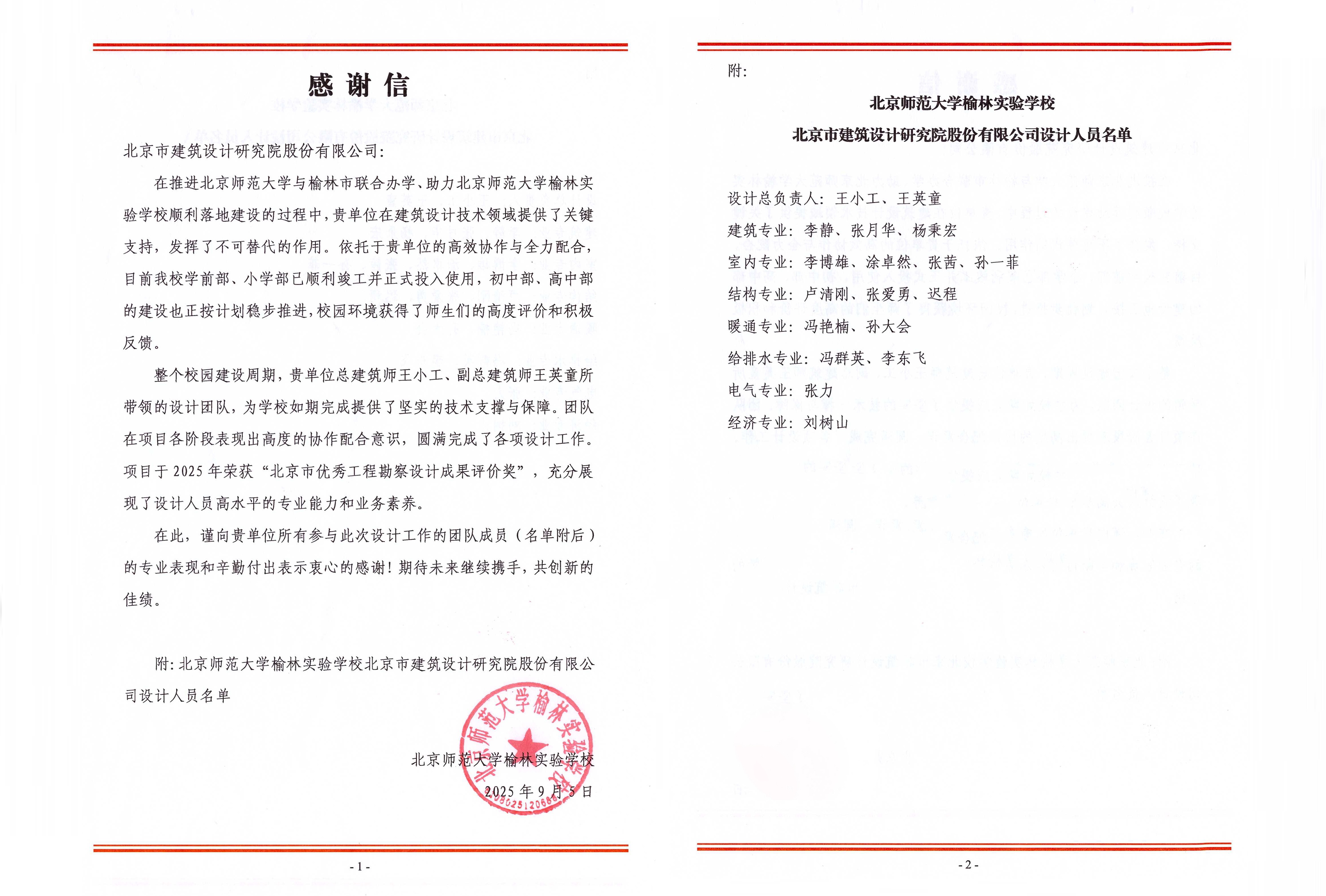 信中对北京建院设计团队在推进北京师范大学与榆林市联合办学、助力北京师范大学榆林实验学校顺利落地建设过程中的专业表现和辛勤付出表示感谢,并向项目荣获“2025年北京市优秀工程勘察设计成果评价奖”致以祝贺,对设计人员在整个校园建设周期,展现出的高水平专业能力和业务素养给予充分认可。