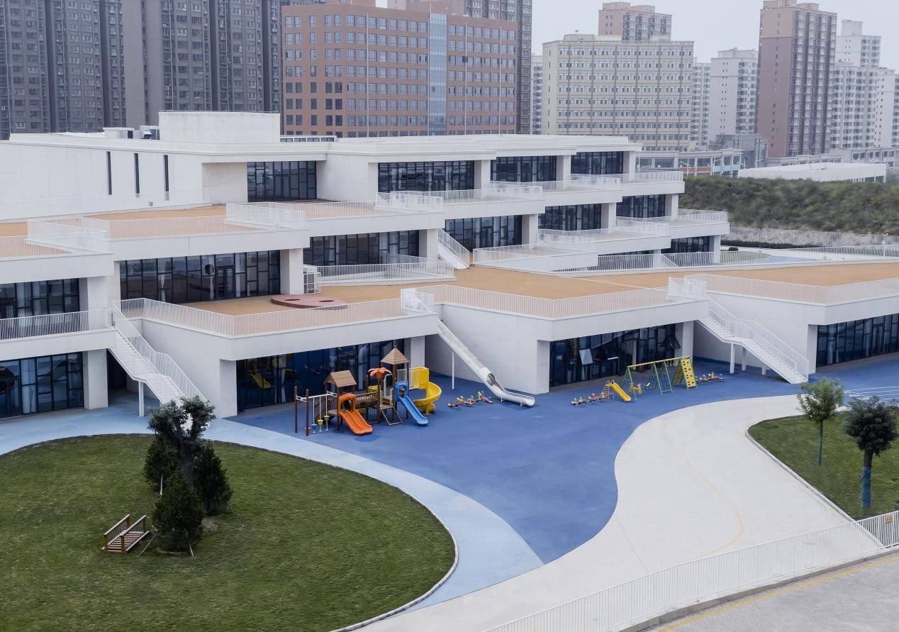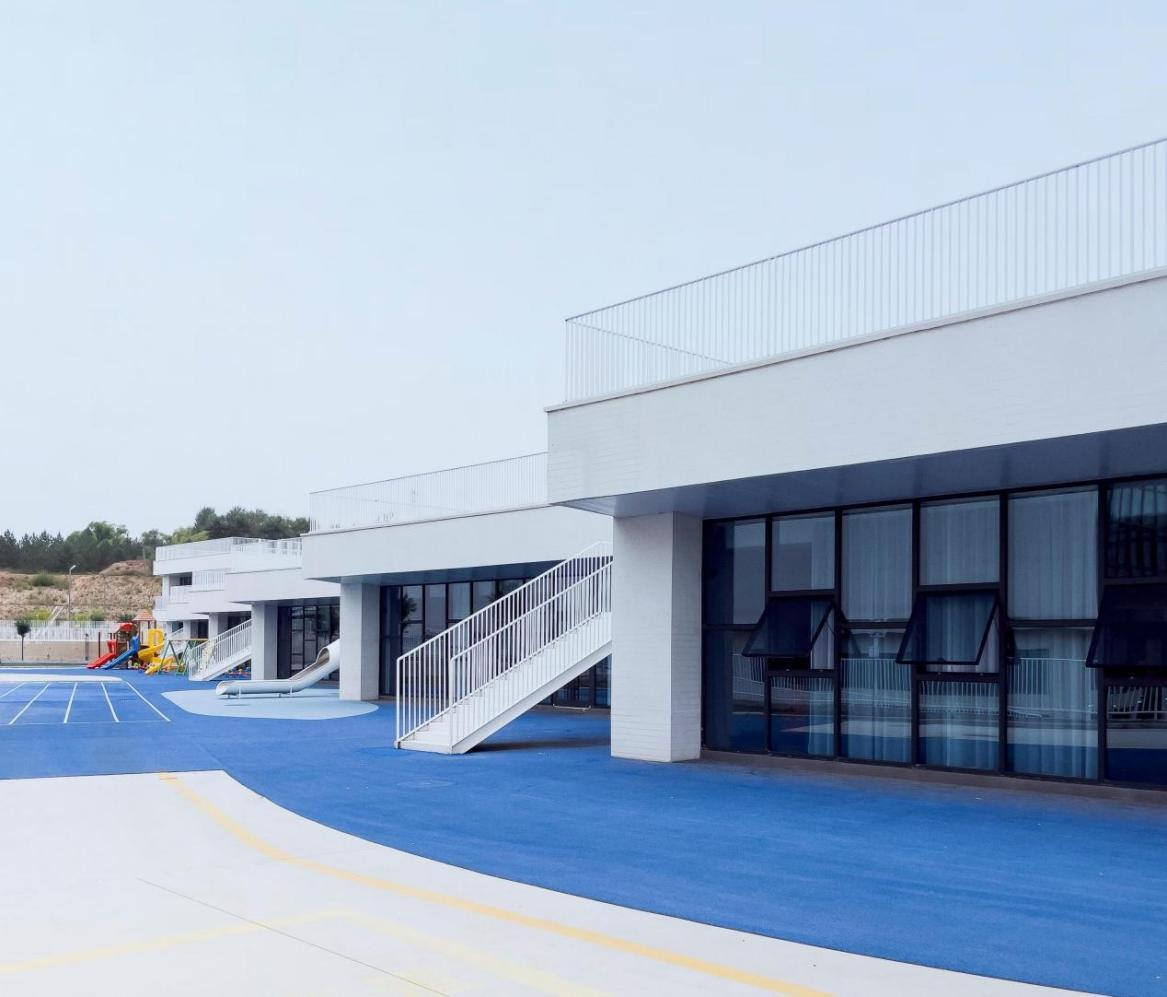 建筑外立面采用白色真石漆作为核心饰面材质,辅以白色金属栏杆,形成简洁统一的建筑风格。场地内的绿色草坪与蓝色橡胶跑道色彩层次丰富,既注入自然生态气息与活动活力,又与建筑外立面形成材质、色彩的和谐呼应。设计以儿童行为需求为核心,打造开放通透、安全舒适的学习活动场所,孩子们在这里自由玩耍、释放天性。