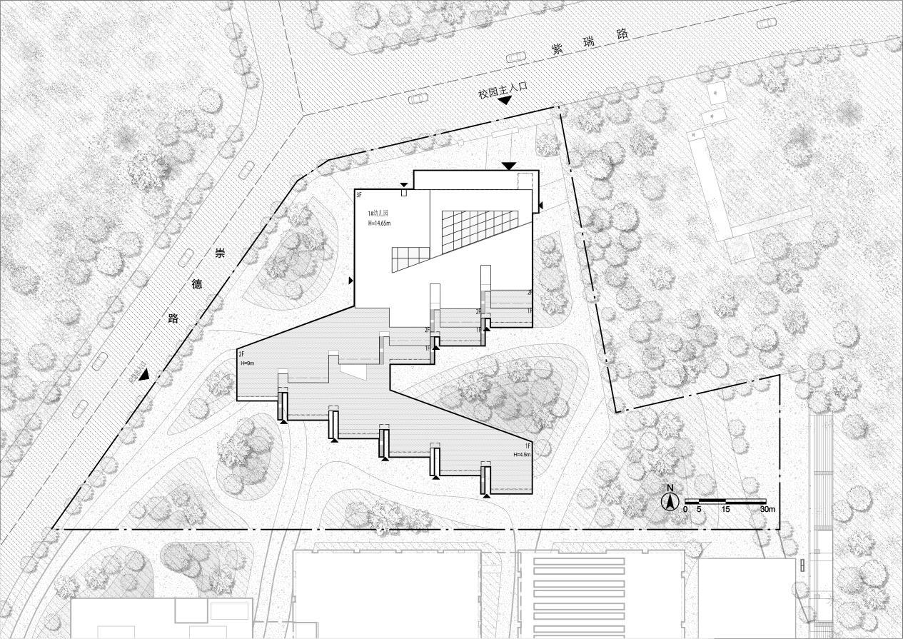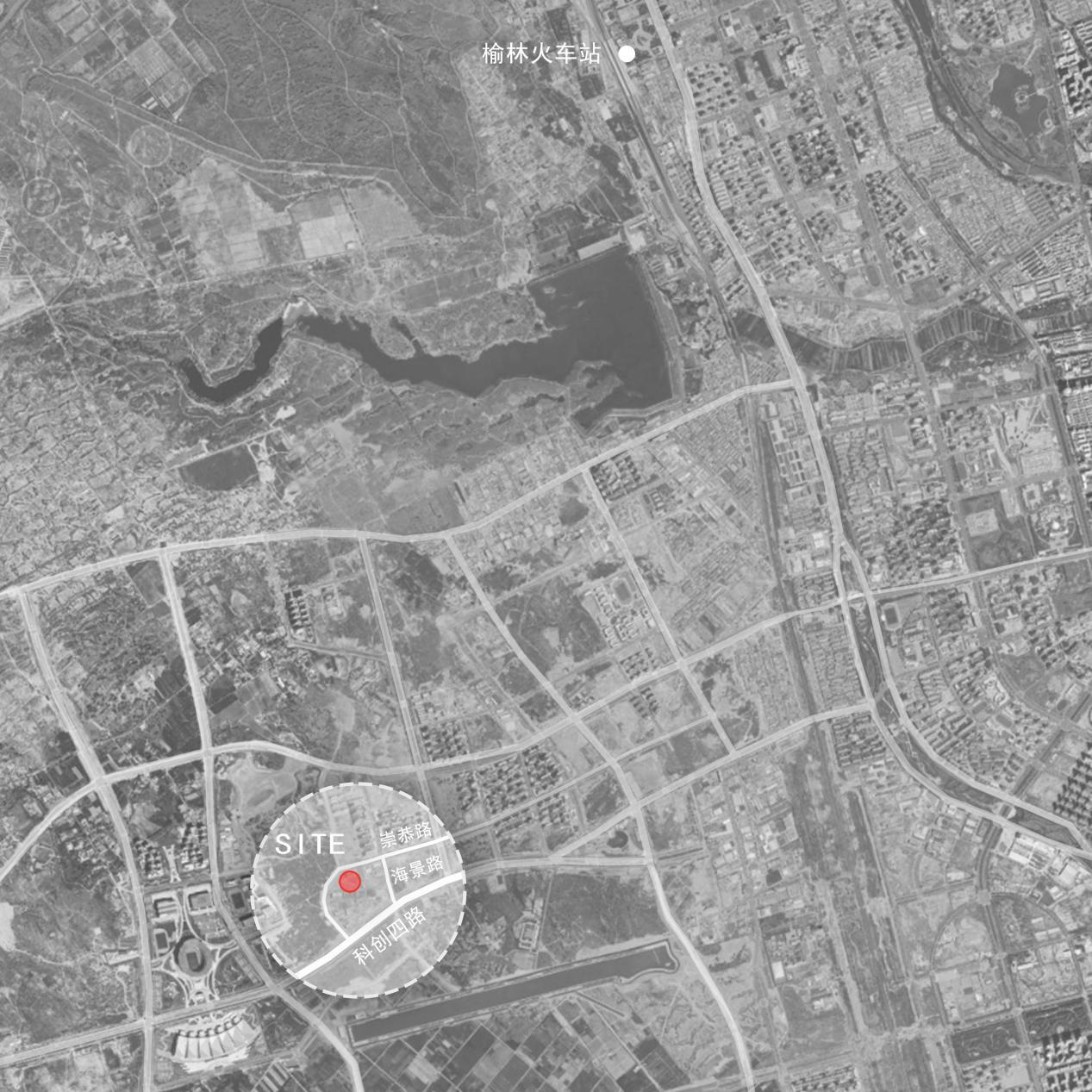 项目位于陕西省榆林市,场地南邻科创四路,东至居然路,西至规划道路,北至紫瑞路。项目用地不规则,设计团队最大化地利用场地完成总体布局,主入口设置在北侧道路上,西侧道路设置应急出入口,南侧紧邻北京师范大学榆林学校小学部地块,东南角地形高差较大,考虑到土方平衡,利用场地现有地形高差打造梯田式实践园地,将园区绿地景观与教育理念相结合,同时也完成幼儿园和小学的景观衔接。